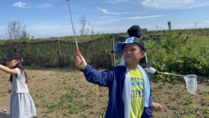子供達は虫とり網で、バッタやトンボを追いかけています。