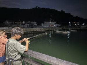 夜釣りにも出かけました。一投目から釣れて興奮したみんなはなかなか釣れず、しだいにカニが産卵で上がってきてるのか?!
