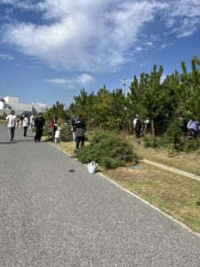 10月4日(土)は、ライオン株式会社さん、picnic earth(ピクニックアース)さん合同で、南浜津波復興祈念公園内の松の剪定を行いました。その後、ピクニックアースさんは、公園内に以前植えた苗木ちゃんの植え直しや、草取りのお手伝いをしていただきました。